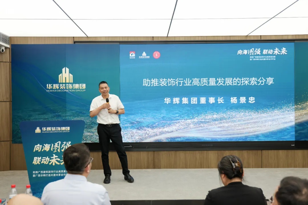 華輝裝飾集團(tuán)董事長楊景忠以深邃的行業(yè)洞察和豐富的實(shí)踐經(jīng)驗(yàn),向與會(huì)嘉賓分享了華輝在助推裝飾行業(yè)高質(zhì)量發(fā)展方面的積極探索。楊景忠指出,裝飾行業(yè)正處在一個(gè)關(guān)鍵的創(chuàng)新升級期,隨著人們生活水平的提高,人們對品質(zhì)、美學(xué)的要求越來越高,裝飾行業(yè)也會(huì)不斷有新的需求市場。未來裝企的三條路是向海圖強(qiáng)——出海、搭建平臺(tái)、依托平臺(tái),華輝致力于打造廣西裝飾行業(yè)的“共建共享合作平臺(tái)”,利用華輝25年的優(yōu)勢和經(jīng)驗(yàn),賦能行業(yè),與行業(yè)企業(yè)攜手共進(jìn),共同應(yīng)對市場挑戰(zhàn),實(shí)現(xiàn)行業(yè)的可持續(xù)發(fā)展。