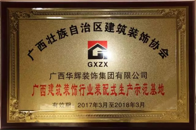 上圖為華輝集團(tuán)獲得的“廣西建筑裝飾行業(yè)裝配化生產(chǎn)示范基地”的牌匾