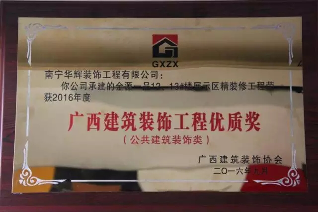 上圖為華輝集團(tuán)獲得的“廣西建筑裝飾工程優(yōu)質(zhì)獎(jiǎng)”的牌匾
