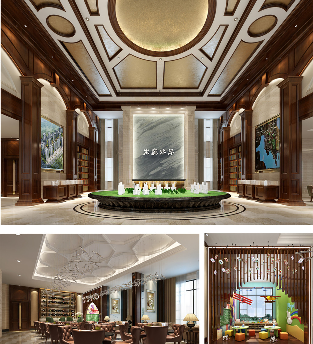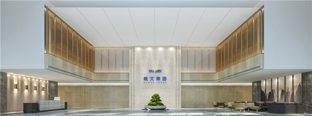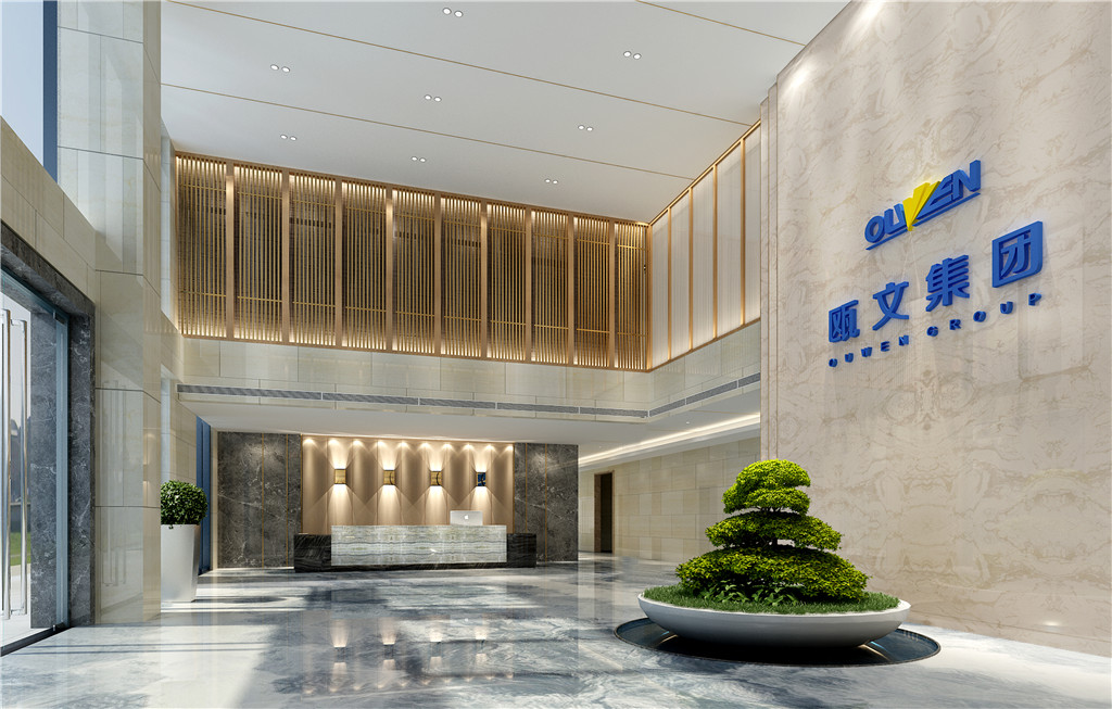 取水之藍(lán)、家之皇為元素,以木飾面、陶瓷、大理石為載體,應(yīng)用于墻面、地面、主背景墻。體現(xiàn)了歐文集團(tuán)厚德載物,開放包容,儒雅熱情迎八方來客的氣魄。