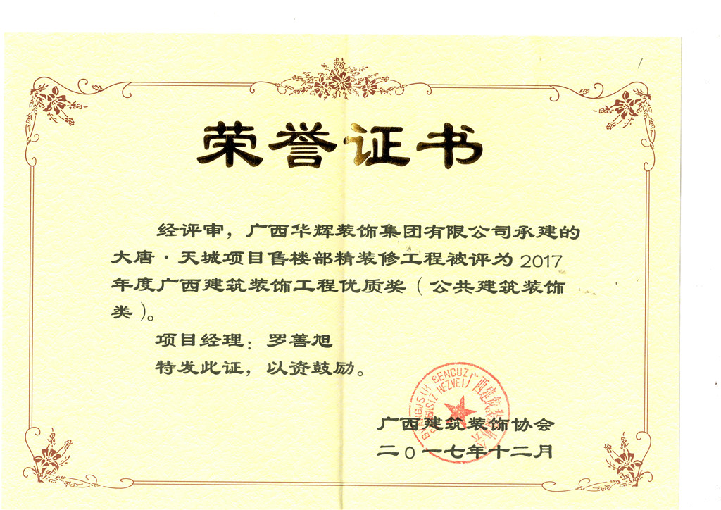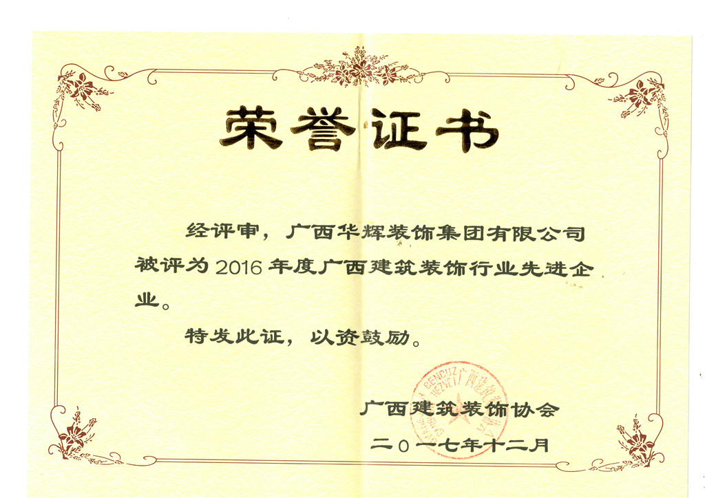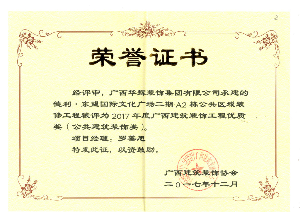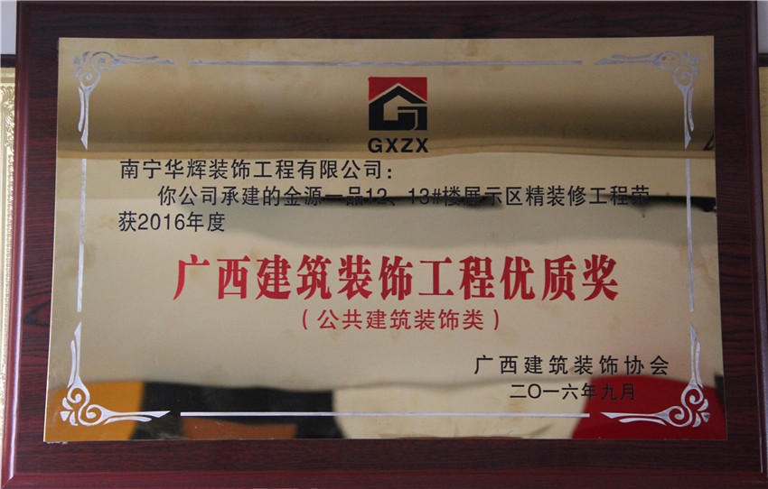 12月,華輝集團(tuán)獲得了“2017年度廣西建筑裝飾工程優(yōu)質(zhì)獎(jiǎng)(公共建筑裝飾類)”、“2016年度廣西建筑裝飾行業(yè)先進(jìn)企業(yè)”、“2016年度廣西建筑裝飾行業(yè)優(yōu)秀企業(yè)經(jīng)理”及“2016年度廣西建筑裝飾行業(yè)優(yōu)秀建筑裝飾設(shè)計(jì)師”榮譽(yù)稱號(hào)。
