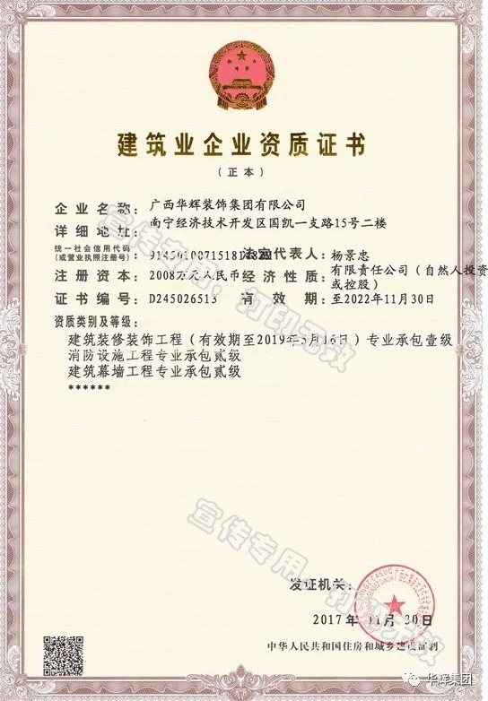 12月,華輝集團(tuán)喜獲建筑消防設(shè)施工程專業(yè)承包貳級(jí)、建筑幕墻工程專業(yè)承包貳級(jí)的資質(zhì)。