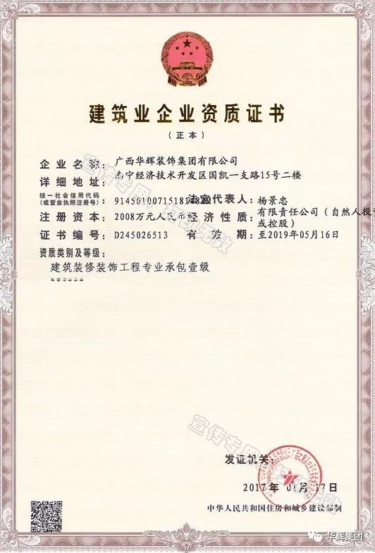 1月,華輝集團(tuán)喜獲建筑裝修裝飾工程專業(yè)承包壹級(jí)。