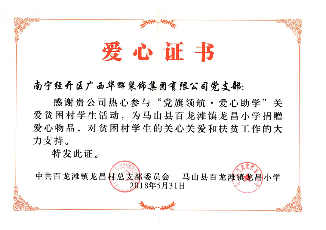 ▲龍昌小學(xué)贈(zèng)予華輝集團(tuán)的愛心證書