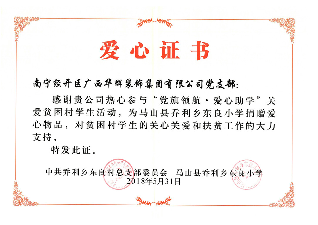 ▲東良小學(xué)贈(zèng)予華輝集團(tuán)的愛心證書