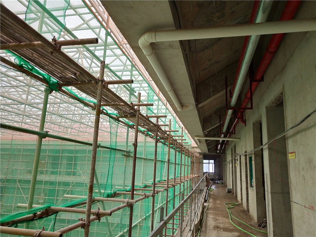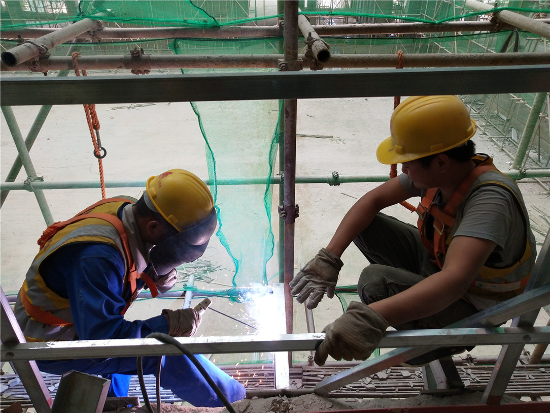 ▲焊工作業(yè)人員全部武裝上陣認真焊接中庭延伸走廊鋼結構工程