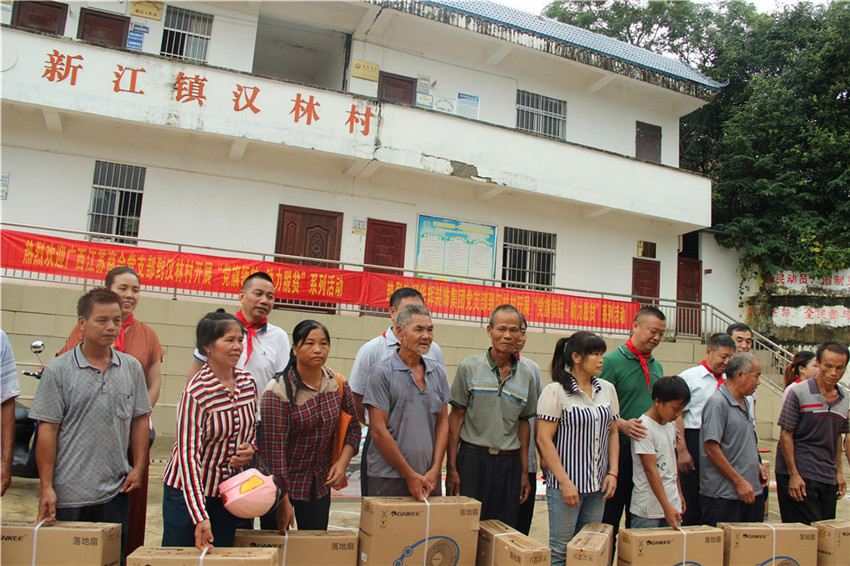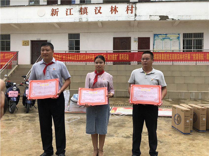 在活動(dòng)現(xiàn)場,廣西華輝裝飾集團(tuán)黨支部攜手廣西江蘇商會(huì)黨支部,共同捐贈(zèng)了160套冬季校服及若干運(yùn)動(dòng)器材、文具等給漢林小學(xué)的孩子們,希望孩子們在新的學(xué)期里能穿上統(tǒng)一的校服,快快樂樂地學(xué)習(xí)成長。同時(shí),捐贈(zèng)了20噸水泥、30臺落地扇、2輛電動(dòng)車等生活必需品給村里的鄉(xiāng)親們,希望能幫助大家修筑家園,營造舒適的生活環(huán)境。