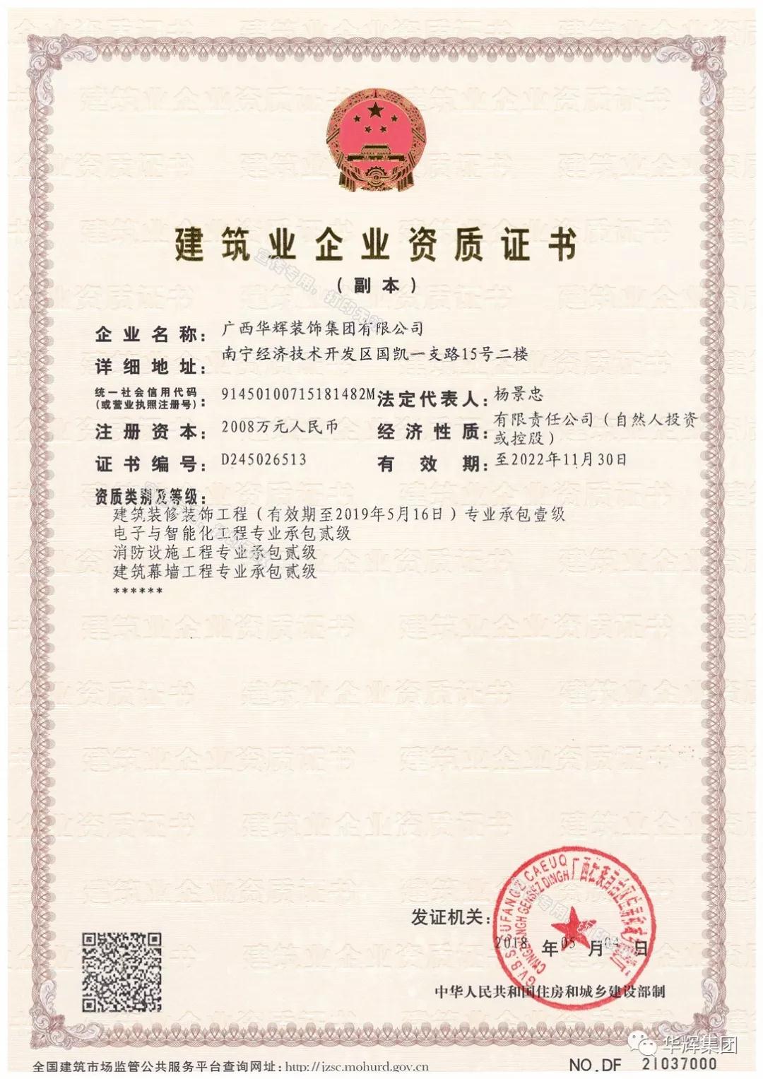 ▲華輝裝飾集團喜獲電子與智能化工程專業(yè)承包貳級資質、建筑工程施工總承包叁級資質、機電工程施工總承包叁級資質!