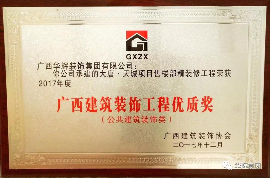 ▲3月29日,廣西建筑裝飾協(xié)會第六次會員代表大會暨表彰大會上,華輝裝飾集團喜獲多個獎項:“2017年度廣西建筑裝飾工程優(yōu)質獎(公共建筑裝飾類)”,“2016年度廣西建筑裝飾行業(yè)先進企業(yè)”,“2016年度廣西建筑裝飾行業(yè)優(yōu)秀企業(yè)經(jīng)理”及“2016年度廣西建筑裝飾行業(yè)優(yōu)秀建筑裝飾設計師”