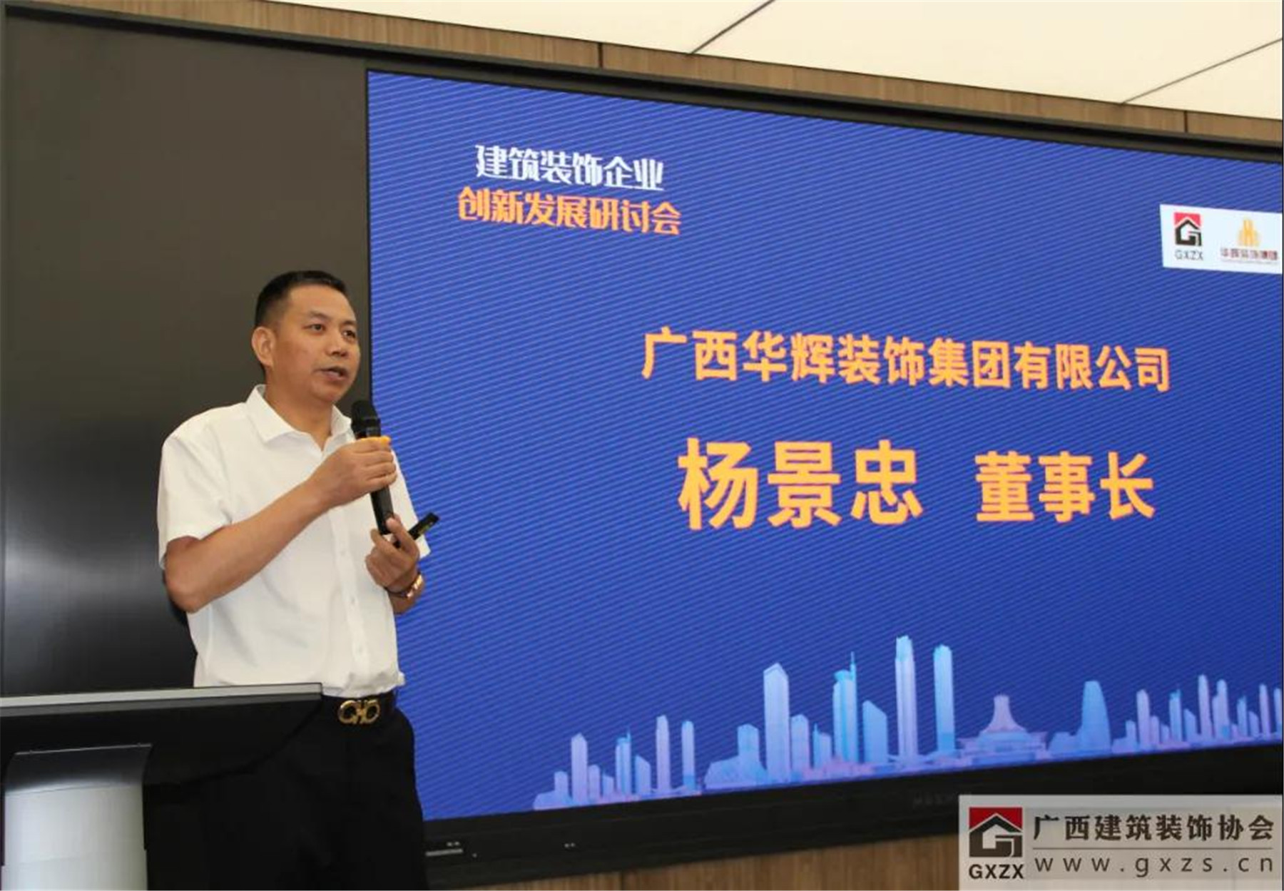協(xié)會副會長、廣西華輝裝飾集團有限公司董事長楊景忠在會上分享了“三駕馬車驅動華輝轉型升級”的重要作用。