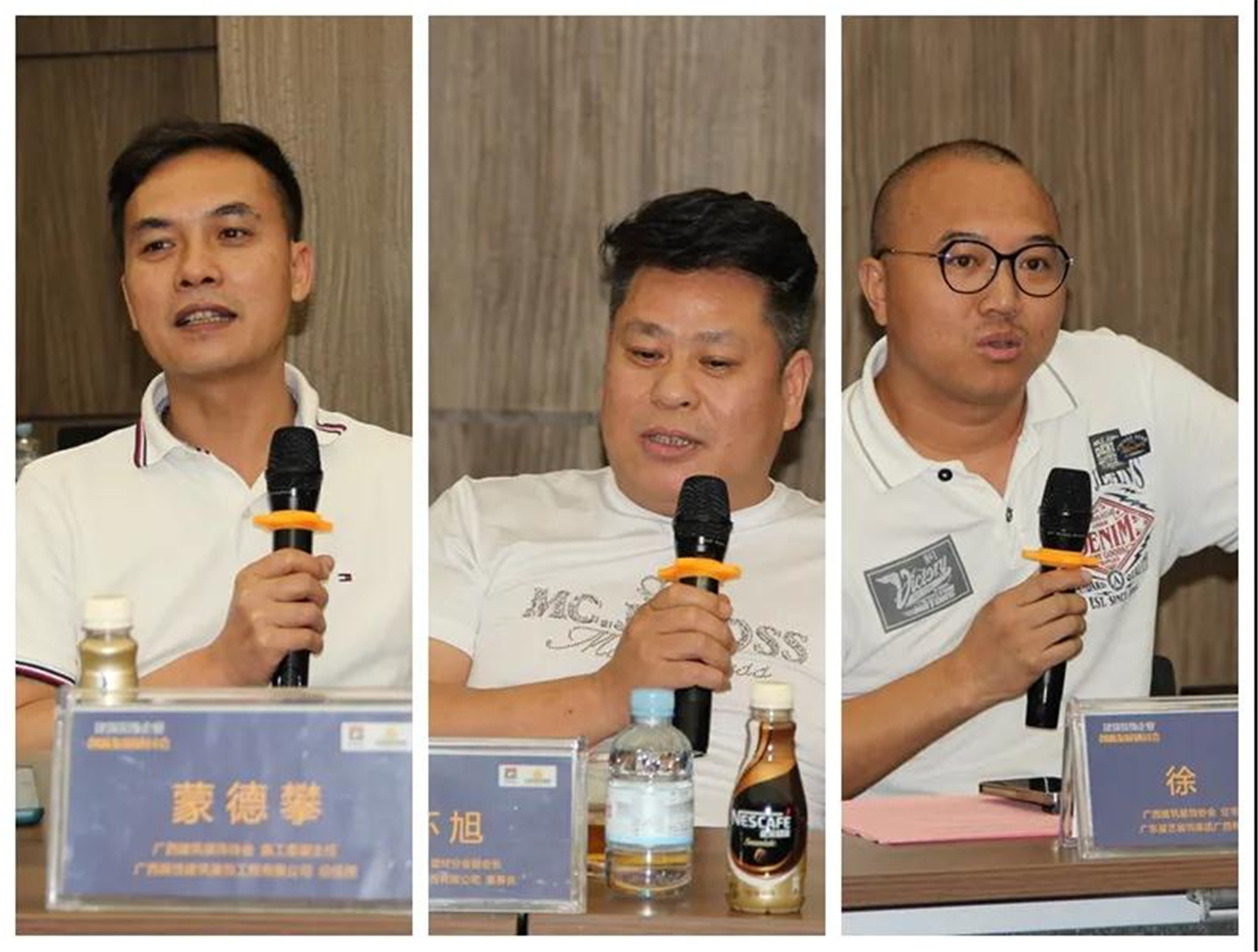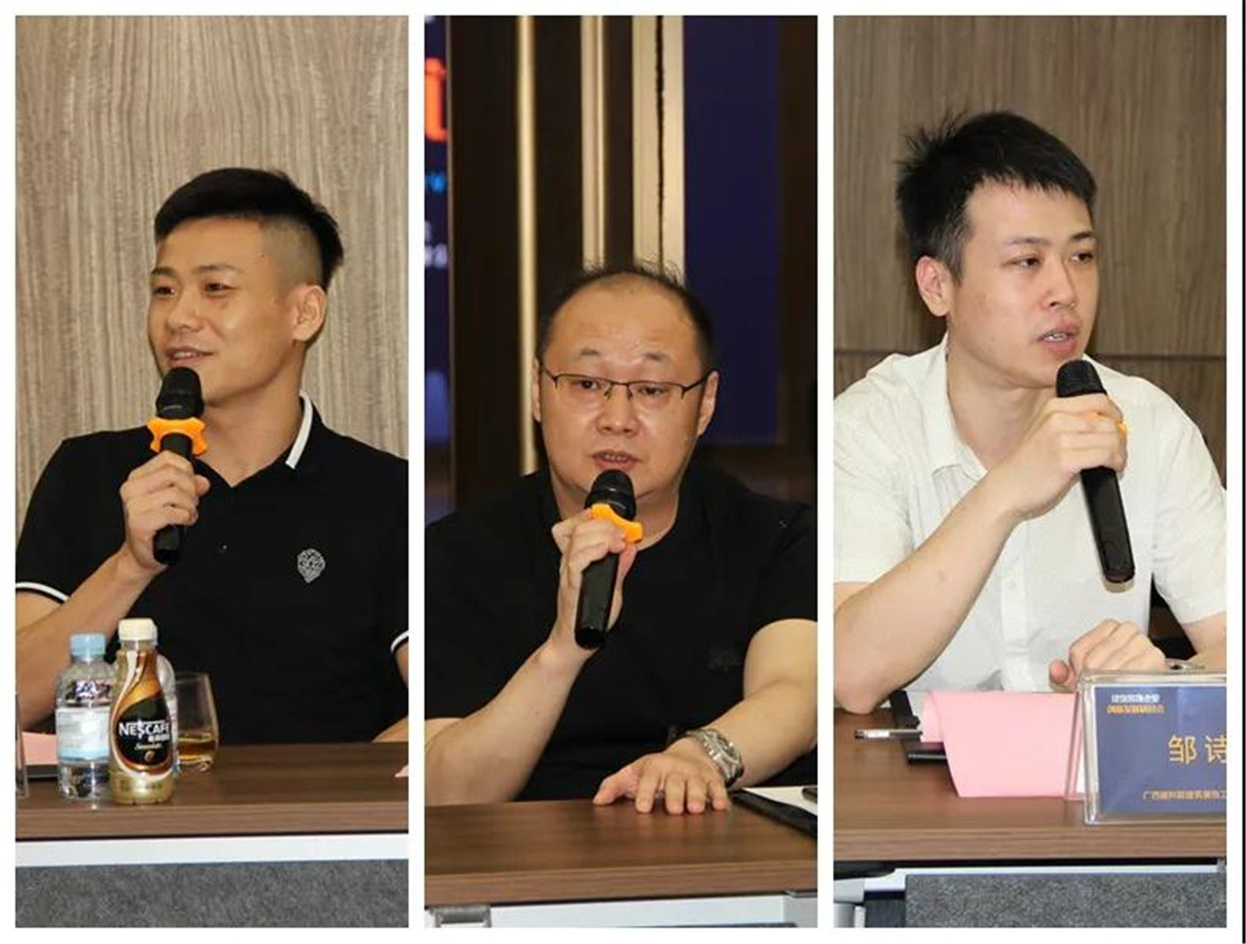▲(左)施工委副主任、廣西聯(lián)飾建筑裝飾工程有限公司總經理 蒙德攀,(中)建材分會副會長、廣西筑之星裝飾設計工程有限公司董事長 林懷旭,(右)住宅裝修分會副會長、 廣東星藝裝飾集團廣西有限公司區(qū)域總監(jiān) 徐橘