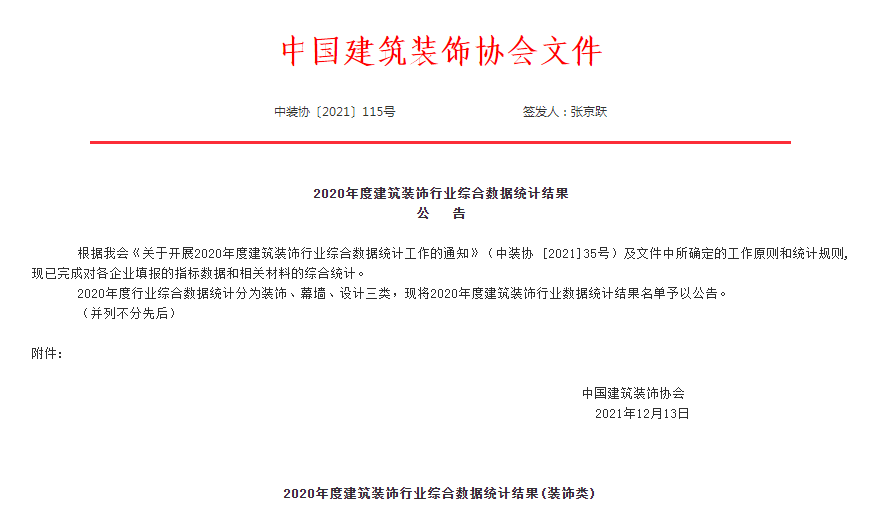 “中國建筑裝飾行業(yè)綜合數(shù)據(jù)統(tǒng)計工作”是由中國建筑裝飾協(xié)會主辦,采用市場評價的方式,通過嚴格審查參評企業(yè)年度的各項數(shù)據(jù),測評企業(yè)財務(wù)年度指標、質(zhì)量技術(shù)指標、人力資源指標,企業(yè)年度各類工程的獲獎情況,專利情況,嚴格參照國家標準、行業(yè)標準、地方標準進行層層測評,分為裝飾類、幕墻類、設(shè)計類三項,受到業(yè)界的廣泛認可。