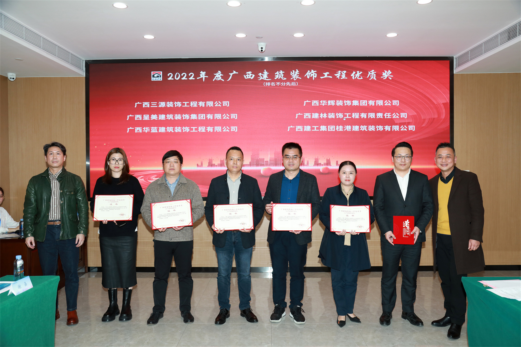 會議宣讀并表彰了“2022年廣西建筑裝飾工程優(yōu)質(zhì)獎(廣西建筑裝飾工程最高質(zhì)量獎)”獲獎項目,華輝集團四個項目榮獲表彰,分別為:廣西社區(qū)養(yǎng)老示范中心裝修工程設(shè)計施工總承包項目,金城廣場一期工程,廣西北部灣銀行五象總部大廈非標(biāo)準(zhǔn)層裝修項目,盛天西城希爾頓歡朋酒店客房、公共區(qū)域裝飾裝修工程。