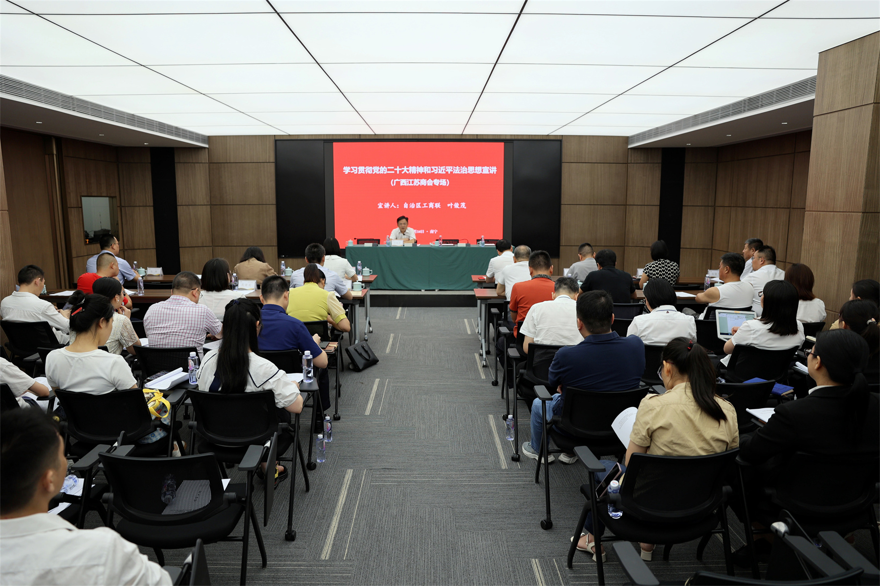 2023年6月14日,自治區(qū)工商聯(lián)2023年“法律進(jìn)商會(huì)”“法律進(jìn)民營企業(yè)”暨防范非法集資宣傳活動(dòng),在廣西華輝裝飾集團(tuán)舉行。自治區(qū)工商聯(lián)副主席葉俊茂出席活動(dòng)并作學(xué)習(xí)貫徹黨的二十大精神和習(xí)近平法治思想宣講。集團(tuán)董事長楊景忠率公司管理人員及員工代表參加了活動(dòng)。