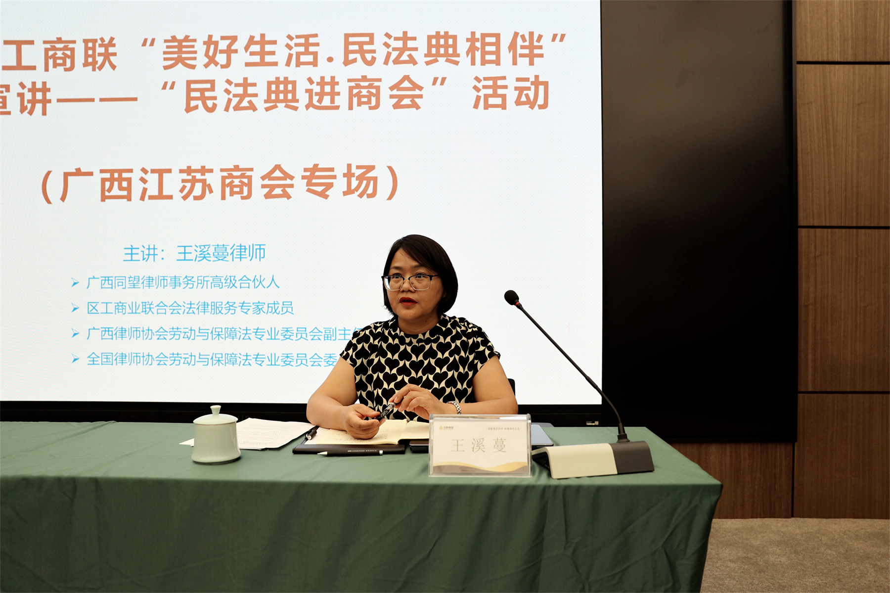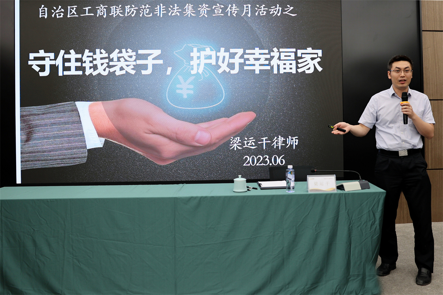 活動(dòng)圍繞“美好生活·民法典相伴”“優(yōu)化法治化營商環(huán)境”“守住錢袋子·護(hù)好幸福家”等主題開展民法典、廣西優(yōu)化營商環(huán)境條例和防范非法集資普法宣傳,進(jìn)一步提升工商聯(lián)所屬商會(huì)依法辦事能力和法律服務(wù)水平,提高民營企業(yè)誠信廉潔守法合規(guī)經(jīng)營和法律風(fēng)險(xiǎn)防范意識(shí),一體推進(jìn)法治民企、誠信民企和清廉民企建設(shè)。