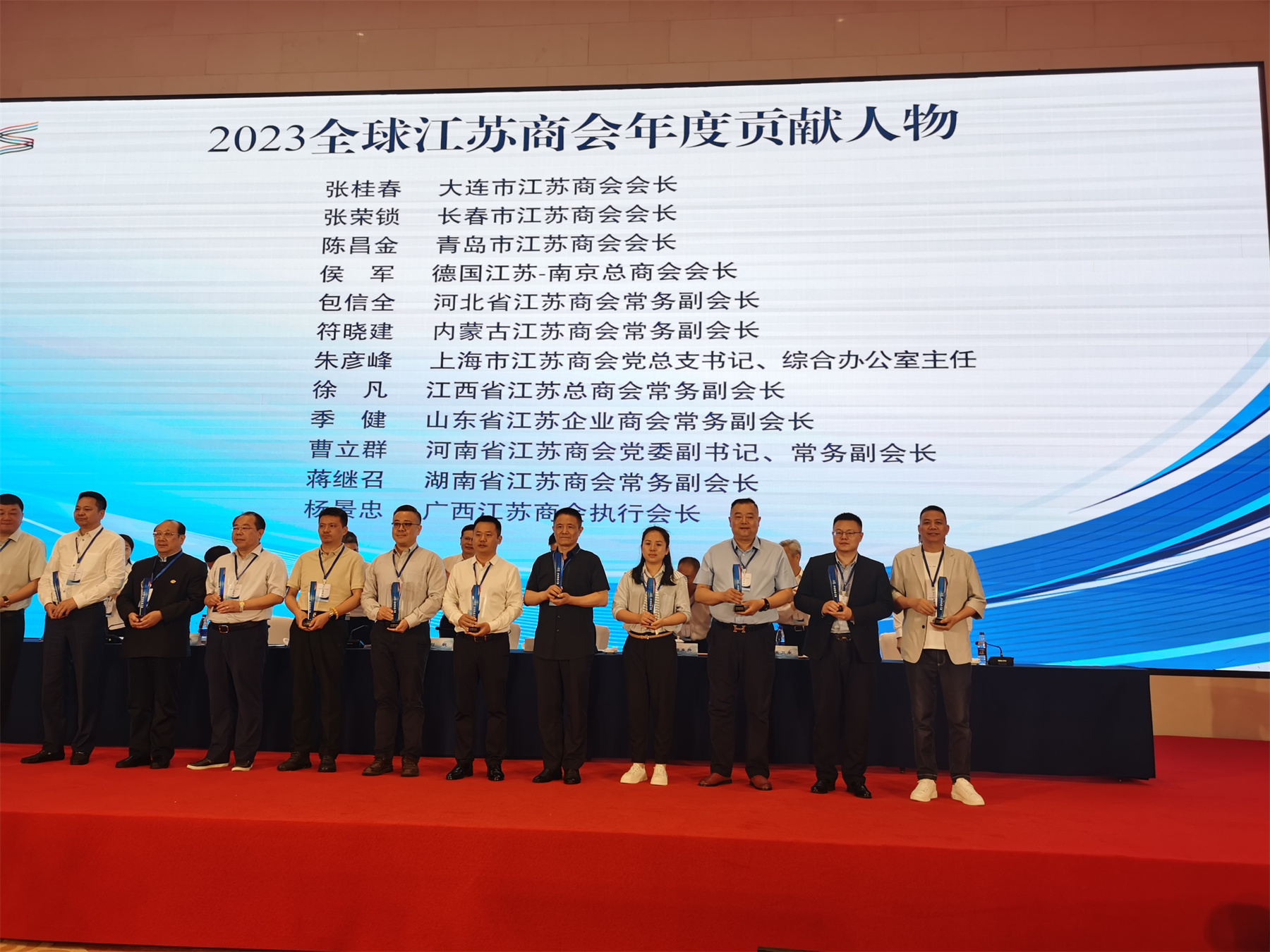 ▲楊景忠(右一)上臺接受“2023全球江蘇商會年度貢獻人物”表彰