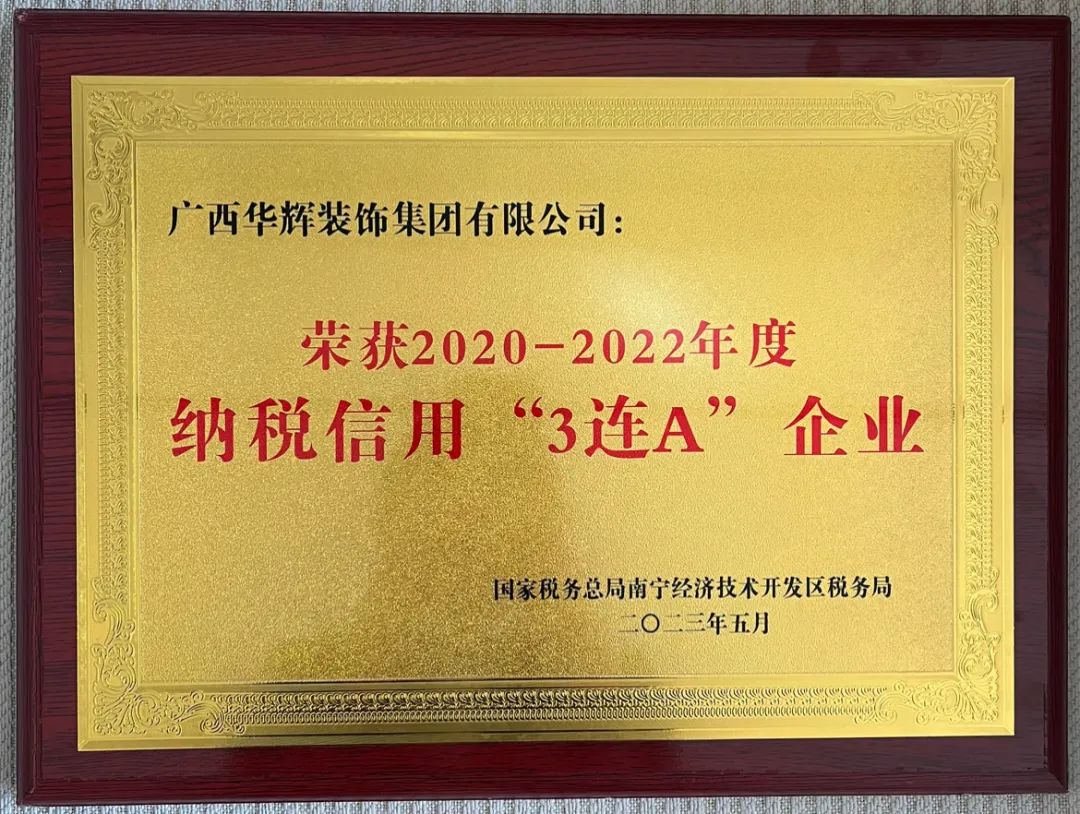 近日,廣西華輝裝飾集團憑借良好的納稅信譽,獲得國家稅務(wù)總局南寧經(jīng)濟技術(shù)開發(fā)區(qū)稅務(wù)局2020-2022年度納稅信用“3連A企業(yè)”榮譽稱號。