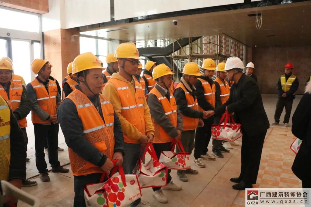 喻俊明向工人代表和管理人員代表發(fā)放慰問品,將新春的祝福和關(guān)愛送到在節(jié)日期間辛勤勞作的基層職工手中,感謝他們?yōu)閺V西建筑業(yè)高質(zhì)量發(fā)展做出的貢獻,叮囑他們在工作期間注意安全,做好防護及針對低溫天氣的防寒保暖措施。喻俊明表示,2023年,在自治區(qū)黨委、政府的正確領(lǐng)導(dǎo)下,全區(qū)建筑業(yè)穩(wěn)步發(fā)展,其中也包含有全區(qū)建筑裝飾行業(yè)廣大企業(yè)、廣大工友的辛苦付出。建筑裝飾裝修是人民群眾對美好生活的向往和追求的重要體現(xiàn),這要求我們要緊緊圍繞人民群眾的需求,不斷加強項目施工質(zhì)量、安全管理,注重新技術(shù)、新工藝、新材料的運用,積極提升工藝技術(shù)和水準,建造出更多裝飾精品工程,為全區(qū)住房城鄉(xiāng)建設(shè)事業(yè)高質(zhì)量發(fā)展和建設(shè)新時代壯美廣西作出新的更大貢獻。?