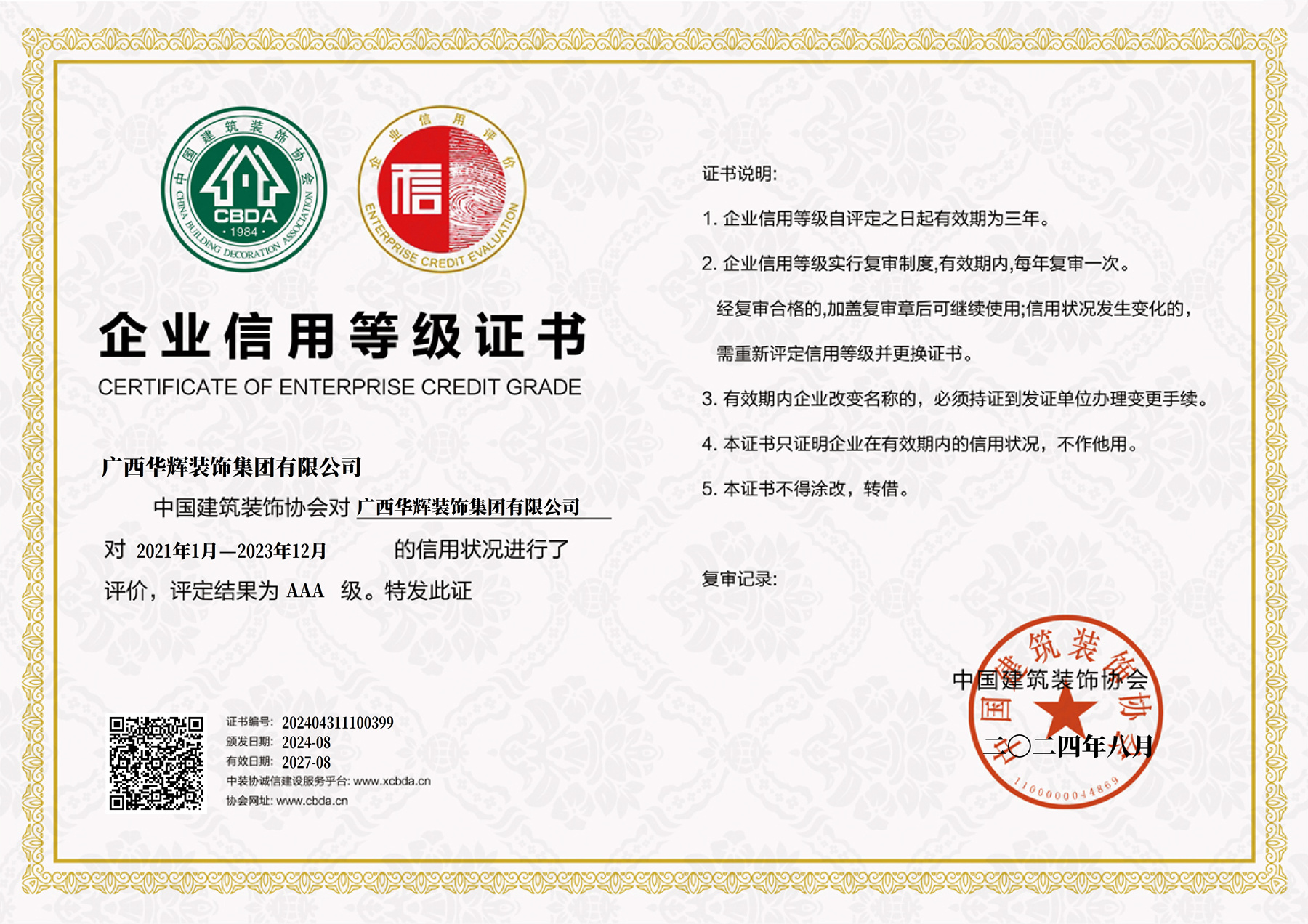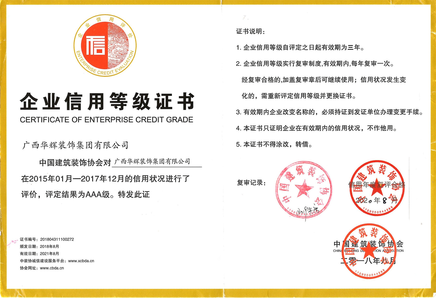 “AAA級(jí)信用企業(yè)”是中國(guó)建筑裝飾行業(yè)企業(yè)主體信用等級(jí)評(píng)定的最高級(jí)別,是對(duì)參評(píng)企業(yè)主體資質(zhì)、經(jīng)營(yíng)管理、財(cái)務(wù)實(shí)力,市場(chǎng)競(jìng)爭(zhēng)力及信譽(yù)度等進(jìn)行全方位嚴(yán)格考核后的評(píng)定,在行業(yè)內(nèi)和社會(huì)上具有較高的影響力。