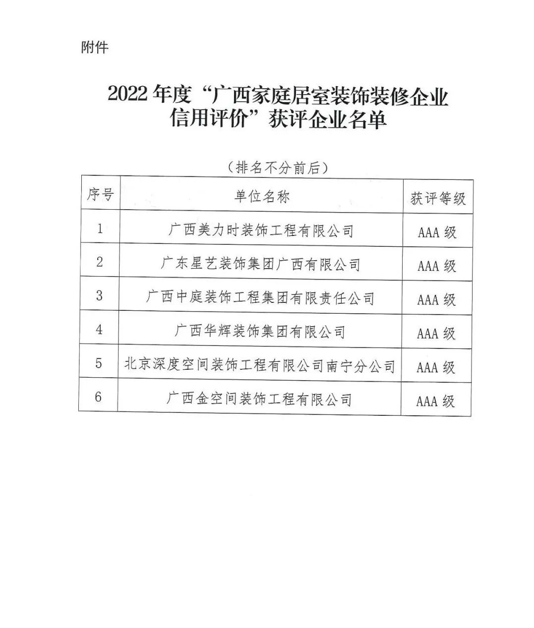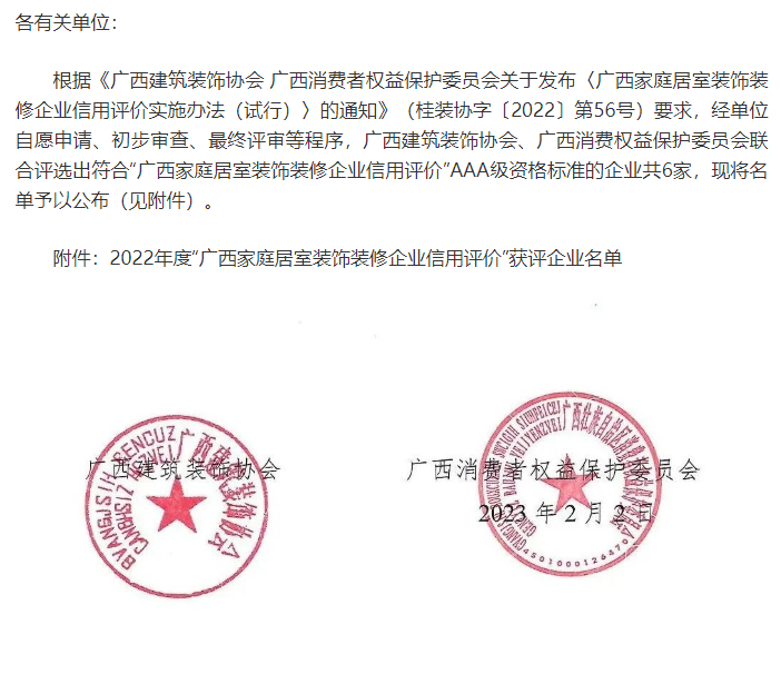 2023年2月2日,廣西建筑裝飾協(xié)會(huì)、廣西消費(fèi)者權(quán)益保護(hù)委員會(huì)聯(lián)合發(fā)布通知,評(píng)選出符合“廣西家庭居室裝飾裝修企業(yè)信用評(píng)價(jià)”AAA級(jí)資格標(biāo)準(zhǔn)的企業(yè)共6家,廣西華輝裝飾集團(tuán)有限公司為獲評(píng)企業(yè)之一。